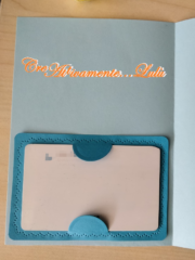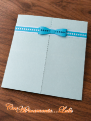 Per l’esterno del biglietto, ho realizzato una fascetta azzurra con al centro un nastrino blu a cuoricini intagliati e un fiocco, per tenere chiusa la scatolina e per inserirvi (sul retro) il bigliettino porta-card regalo con le firme.
