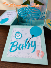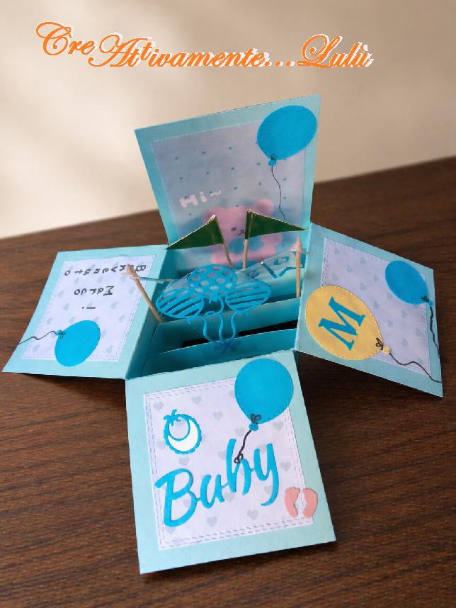 Ho perciò realizzato la struttura della “card in a box” con un cartoncino turchese alto 16 cm e largo 34 cm, con dentro 3 strisce di supporto interne. Ho rivestito i 3 lati apribili con della carta fantasia a cuoricini azzurri, vi ho applicato vari palloncini in toni del blu elettrico e del giallo canarino, oltre ad altri elementi realizzati con le fustelle da bambini che avevo acquistato e utilizzato già alcuni anni fa per un biglietto nascita (impronte dei piedini, bavaglino, scritta “Baby”) e l’iniziale del nome. Poi, con il pennarello nero, ho scritto una dedica di benvenuto e ho disegnato i fili dei palloncini. Il lato di fondo più alto l’ho rivestito con una carta fantasia a pois azzurri con il disegno di un orsetto e vi ho applicato un palloncino.